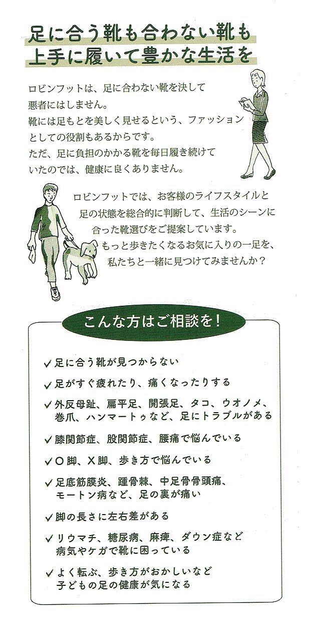 ロビンフット靴店は、足を見させていただき、靴合わせをして、販売しております。 |